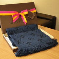 ルイヴィトンからモノグラム・モチーフがざっくりと編まれたウール地とシフォンの2重仕立て、ふんわりした感じがかわいいマフラーです。